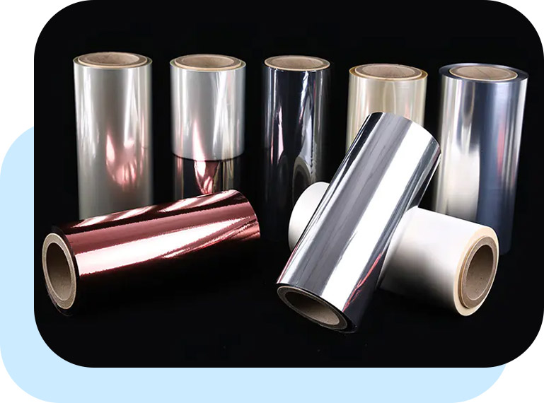 8 Átfogó termékekKülönböző metalizált film (VMPET/VMCPP/VMBOPP), bevonófólia (PVDC/Acril/PVA), Alox Caoted Film (Alox PET a lamináláshoz/nyomtatáshoz), az új és csúcskategóriás termékek folyamatos innovációja.